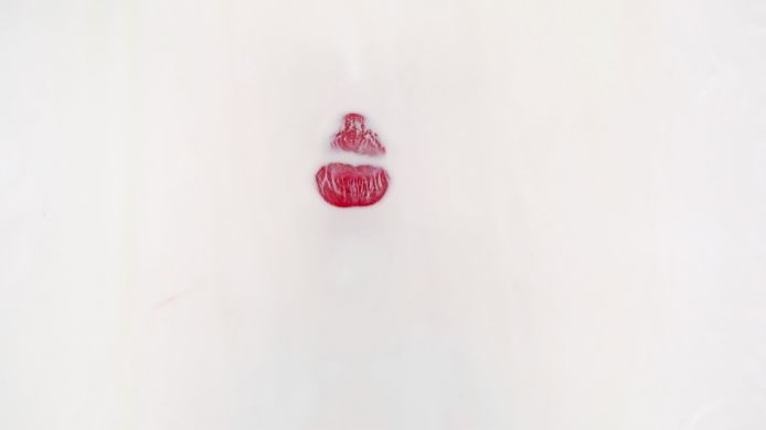 Punaiseksi maalatut huulet liikkuvat lasilla piirtäen kuvion.